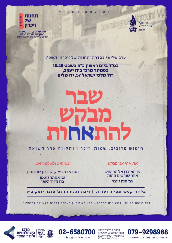 Ganzach Kiddush Hashem invites women to a lecture event titled “Shever Mevakesh Le’Hitachot” (A Fracture Seeks to Heal) focussing on the search for relatives postwar. This event will take place in Hebrew.