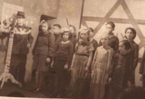 Surviving Jewish children participating in a Chanuka candle lighting ceremony in the Gluszyna DP camp, Poland