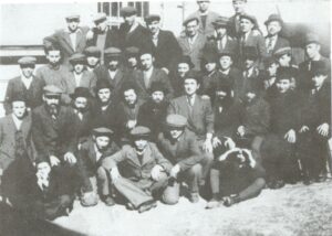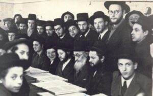 Surviving Jews participate in a class given by Rabbi Shlomo Tzvi HaKohen Strasser in the Santa Cesarea DP camp, Italy. Amongst the students is Mendel Levy.