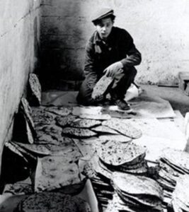 A Jewish boys helps bake matzah in a DP camp in Austria