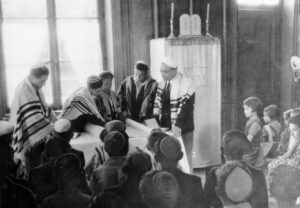 A Torah inauguration ceremony in the synagogue of the Crombach DP camp in Germany