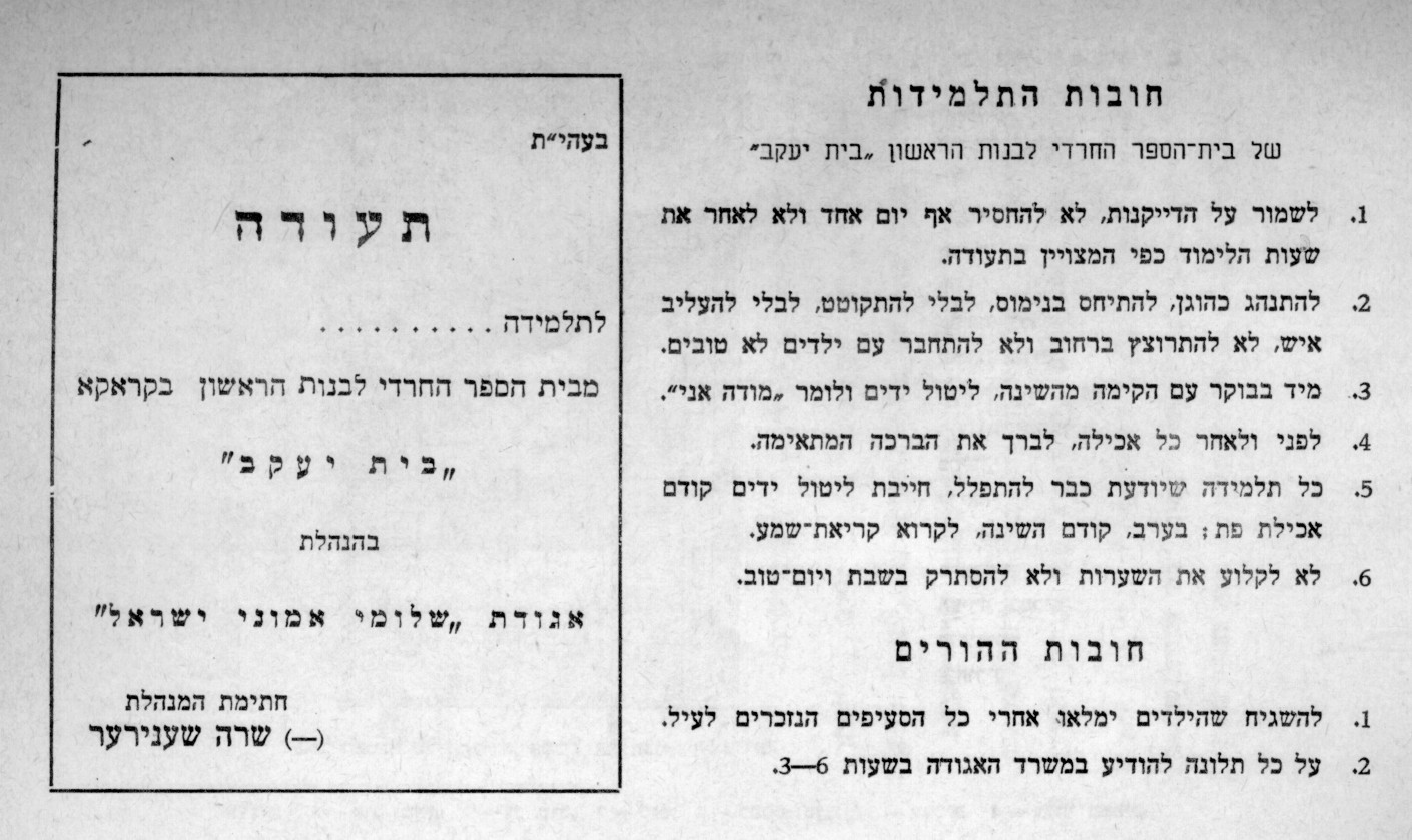 The cover of the certificate issued to the students of the Bais Yaakov school in the city of Krakow. On the right side are the rules and regulations for the students.