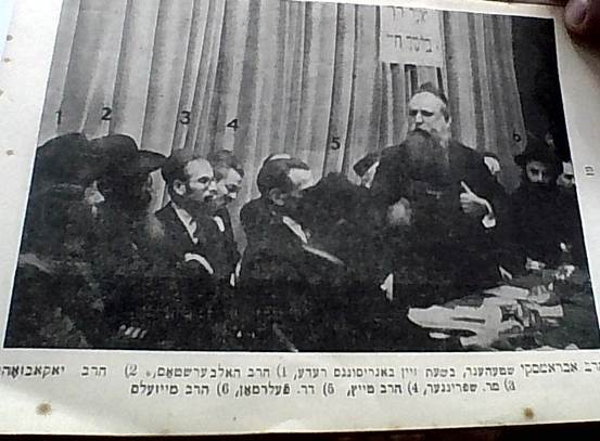 Among the names of the speakers, we find our teacher Rabbi Yaakov Rosenheim (who, at his home in the Land of Israel, wrote down his speeches and these were read in public); The chassid, Rabbi Yitzhak Meir Levin; Rabbi Meisels (Rabbi Zvi Hirsch, who survived Auschwitz and was rabbi of Bergen-Belsen); the genius Rabbi Chaim Yaakov Rotenberg, the rabbi of Antwerp; the Schatz Rebbe from London; the genius Rabbi Yechezkel Abrahamsky; the genius Rabbi Moshe Feinstein, the genius Rabbi Aharon Kotler; Rabbi Oshry; and the Bobover Rebbe, Rabbi Shlomo z”l.
