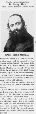 A newspaper article on the remarriage of Rabbi Meisels, when he was a rabbi in Chicago
