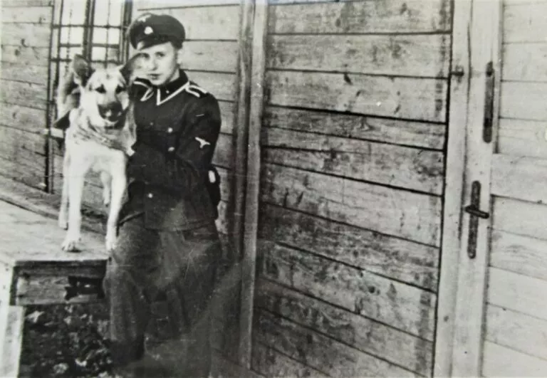 A Nazi camp guard with his German shepherd dog, in Plaszow, a concentration camp near the city of Krakow