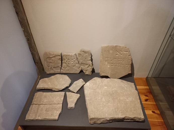Inside there was a mezuzah, kosher. A wide-open Gemara Yoma, a Babylonian Talmud, published by “The Widow and Re’em brothers,” a small siddur, goblets, a broken synagogue menorah and a manual printing machine. There is also an old, worn-out book “Menorat HaMe’or” book and a few seals and pages, and I wonder, why are these things here, who actually gave the artifacts to the museum?… There was a large, magnificent, and deep-rooted Jewish community here, the murderers came and killed everyone, the Poles came and inherited their homes, the heirs of the Poles came and gave the “archival exhibits” to the museum. How simple, how easy… And on the side, next to the glass cabinet, are arranged fragments of tombstones from the Jewish cemetery. By the way, the yahrzeit (anniversary of passing) of the “dear young man, from upstanding roots” will fall on the 16th of Shvat. Where is the young man buried? Who was he and what became of his family? And why, according to the museum management, are these tombstones located here and not in the cemetery from which they were removed?