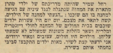 Rachel Shamir, one of the counsellors, mentions the ill health in Tehran of dozens of children sick with dysentery and malaria and how other children gathered around them to sing and cheer them up