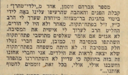 The children were scattered among various institutions. The 14-year-olds chose their own educational institutions. As for the younger ones, Henrietta Szold interviewed each child, and when it turned out that they remembered lighting candles at home, she turned him to religious education. (HaTzofeh)