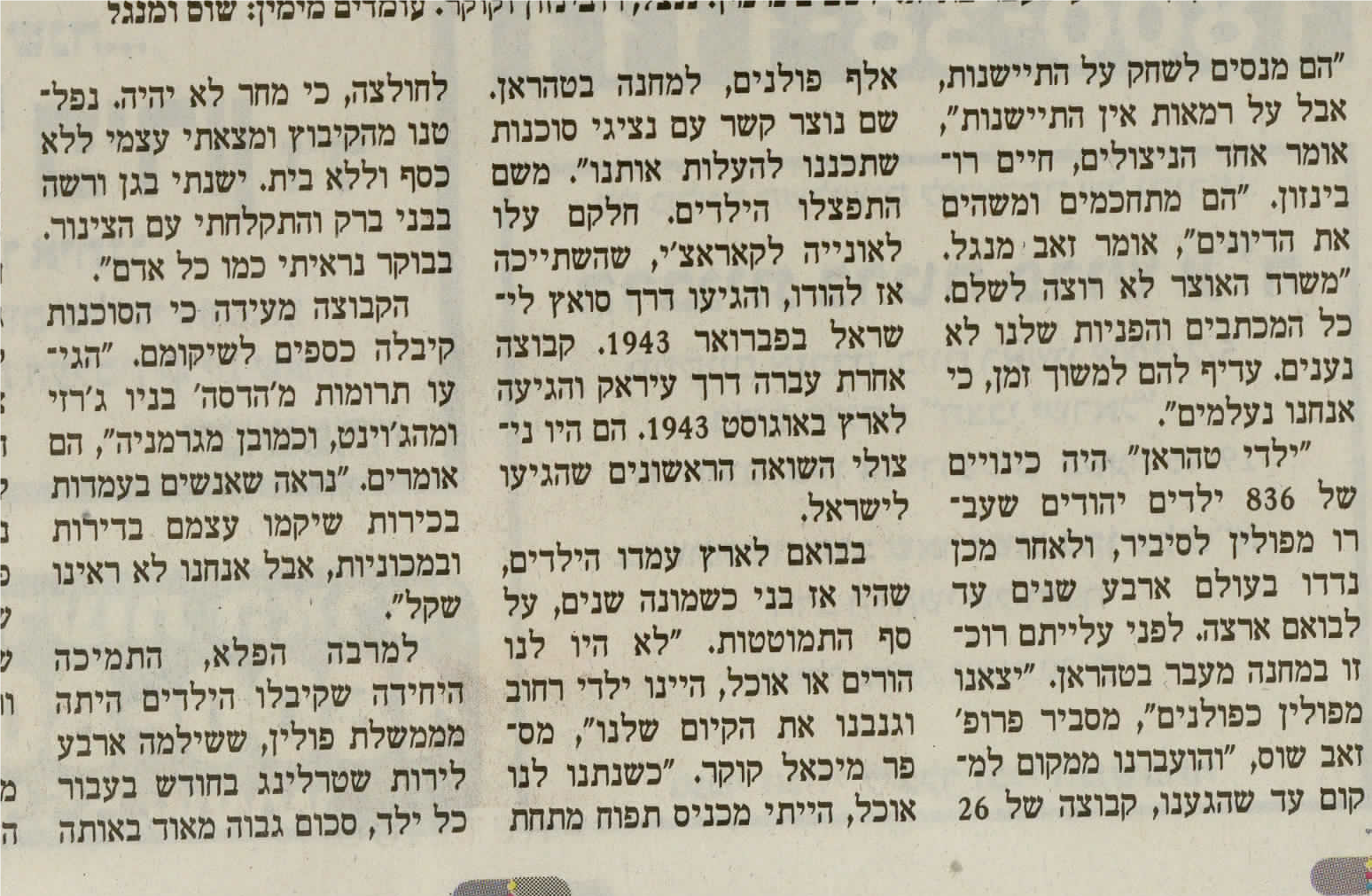 On the eve of Purim 1943, the Tehran Children arrived in Israel. They began their journey in Poland, where they were born. From there they moved to Russia, and after their parents decided not to become naturalized, they were deported to Uzbekistan in Siberia. The Polish government-in-exile, concerned for its citizens, opened institutions for the children of the exilees. Jewish children were not included in this initiative, but several hundred of them managed to enter these orphanages under Christian guise or in some other way.