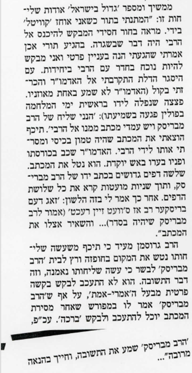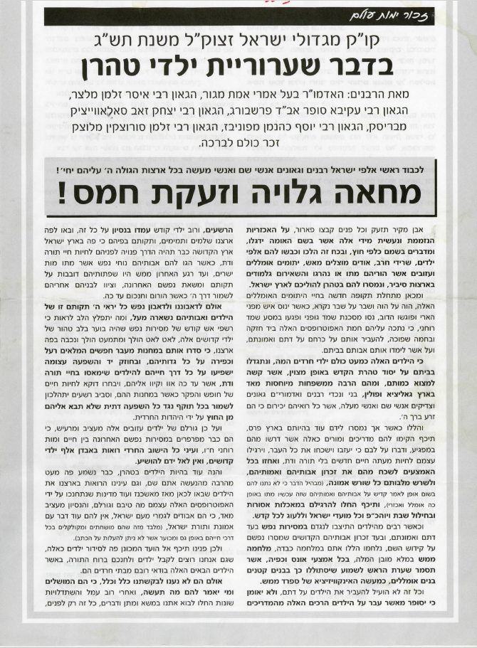 In 5703 (1943), the great Jewish men gathered to fight for the souls of the children and drafted a proclamation boycotting the Jewish Agency. Rabbi Yisrael Grossman z”l tells of a special mission sent by the Brisker Rebbe to ensure that the Gerrer Rebbe signed the rabbinical proclamation. (Interview with the Rabbi, 5770/2009-10)